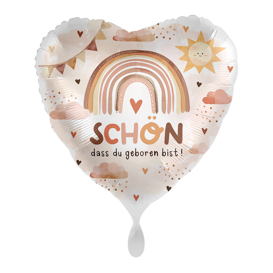 „Schön, dass du geboren bist!“ Ballon-Set – Mit Satin-Herzballons in Karamell, Ziegelrot und Cream